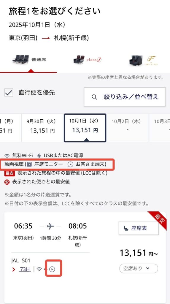 それと「お客さま端末」は座席モニターがなく、自身のスマートフォンで動画視聴となります。